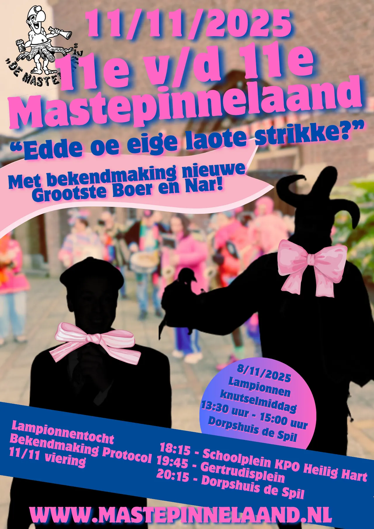 Op dinsdag 11 November 2025 organiseert stichting Kindercarnaval de Mastepinne de 11e v/d 11e viering. Deze zal dit jaar plaatsvinden om 19:45 uur op het kerkplein van Wouwse Plantage na afloop van de jaarlijkse Sint-Maarten lampionnenoptocht. (Bij slecht weer zal dit in Dorpshuis de Spil plaatsvinden). Onder het nieuwe motto "Edde oe eige laote strikke?" zal hier deze avond naast de Prins en Sjampetter dit jaar ook de nieuwe Grootste Boer en Nar gepresenteerd worden. Zij zullen op een ludieke wijze onthuld worden.