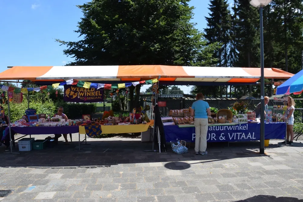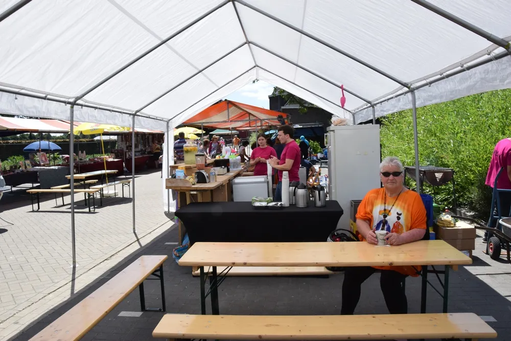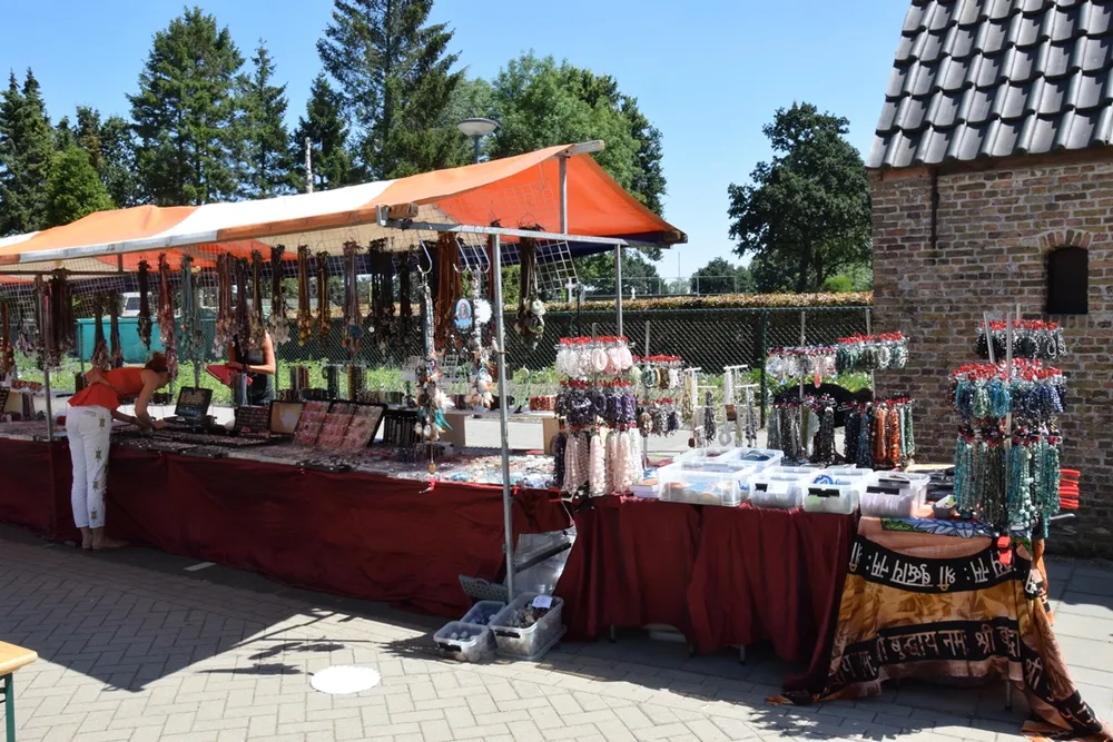Een geslaagde dag voor wie nog niet of juist op vakantie was maar zich in elk geval in het warm Nispen bevond. Aan de ingang kon je je door de tuinman gemaakte groene Tipi je laten gaan door je te onderwerpen aan de zorgen van de Sjamaan. Alice Kelder zo als deze Sjamaan heet heeft zich bekwaamt op het gebied van balans door natuur en klank. Voor ieder wat wils. Wie even
