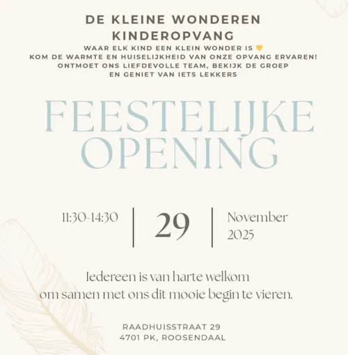 Voor de opvang is gekozen voor een centrale ligging in het centrum van Roosendaal (Raadhuisstraat 29). Er is een tuin met volop speelgelegenheid en parkeergelegenheid aan de achterzijde van het pand. Meer informatie via https://dekleinewonderen.nl